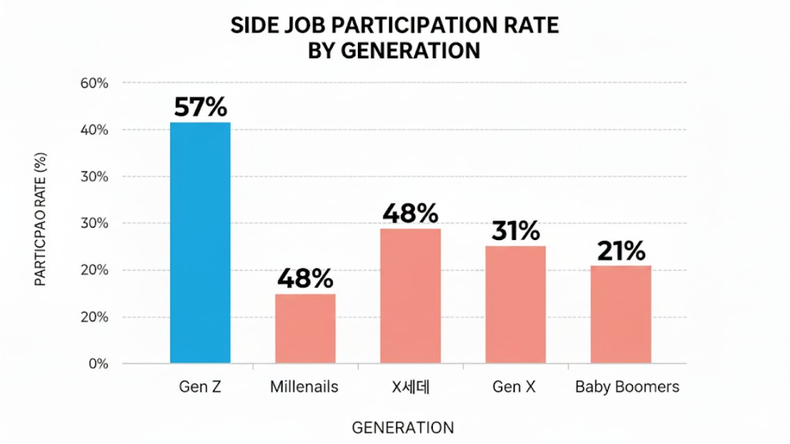 해리스폴 조사에 따르면 Z세대의 부업 참여율은 57%로, 다른 세대를 압도합니다.