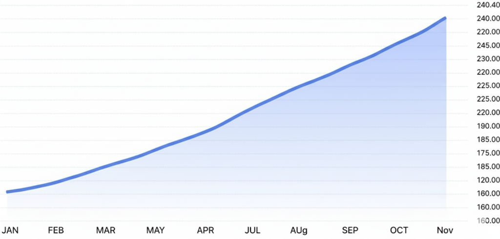 종가 229달러를 돌파하며 5년 만의 최고치를 기록했습니다.